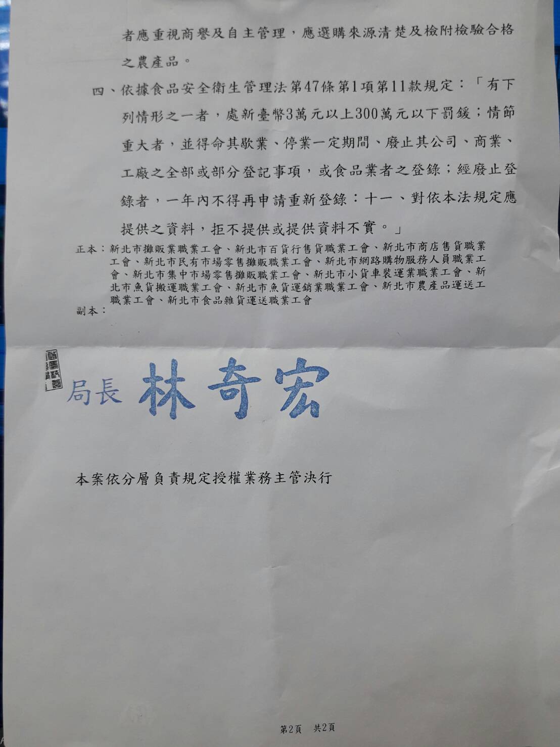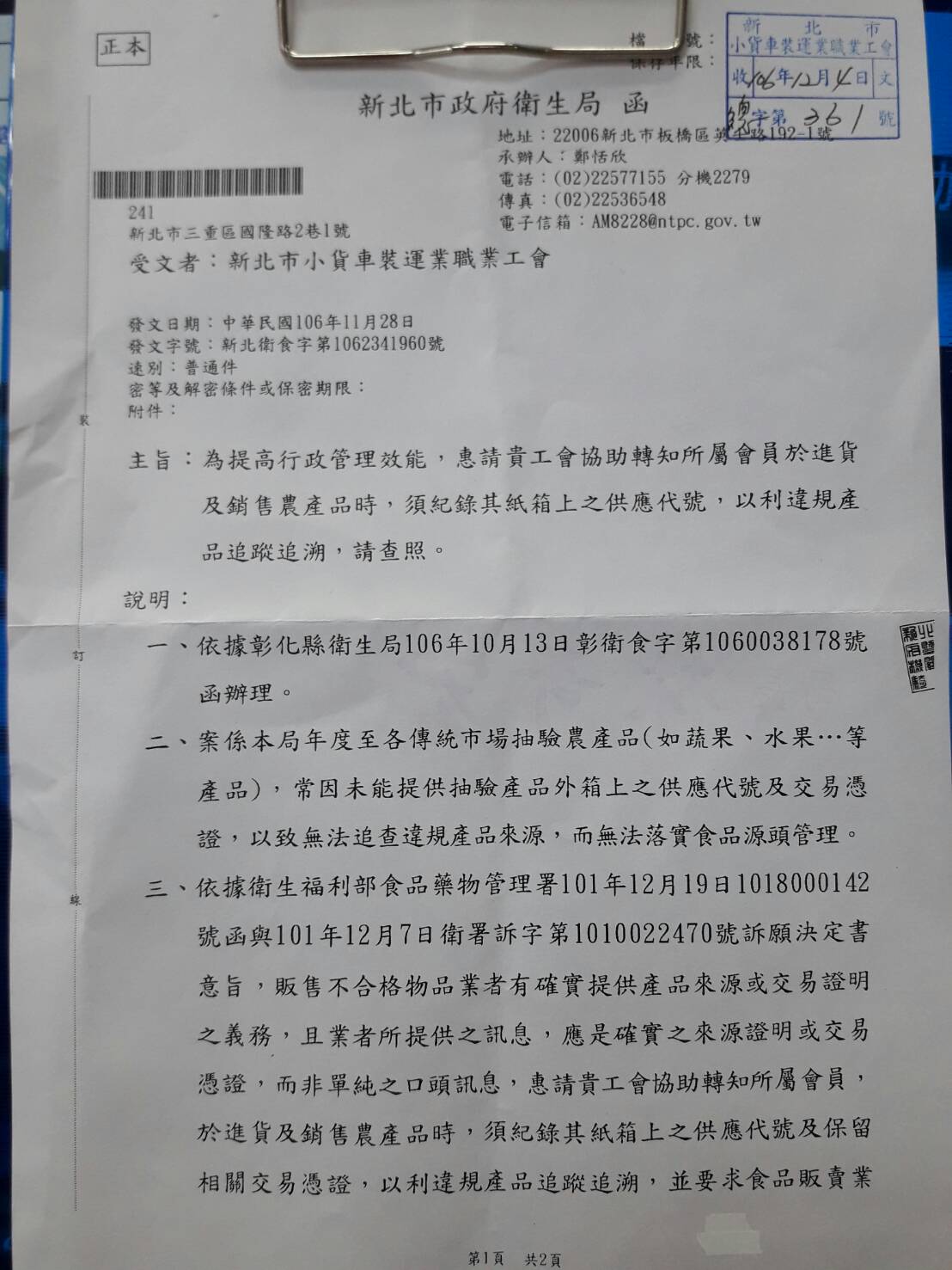 新北市政府衛生局函示:為提高行政管理效能,請於進貨及銷售農產品時,須紀錄其紙箱上之供應代號及保留相關交易憑證,以利違規產品追蹤追溯,謝謝!