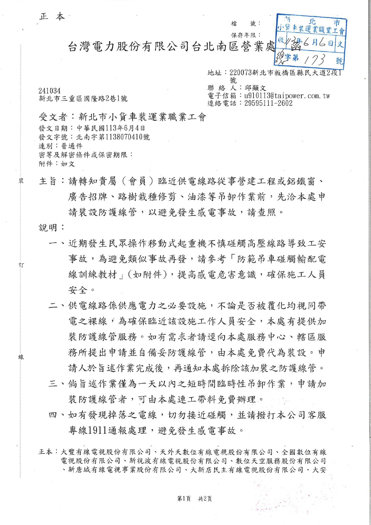 臨近供電線路從事吊卸作業前.請先申請裝設防護線管.以避免感電事故