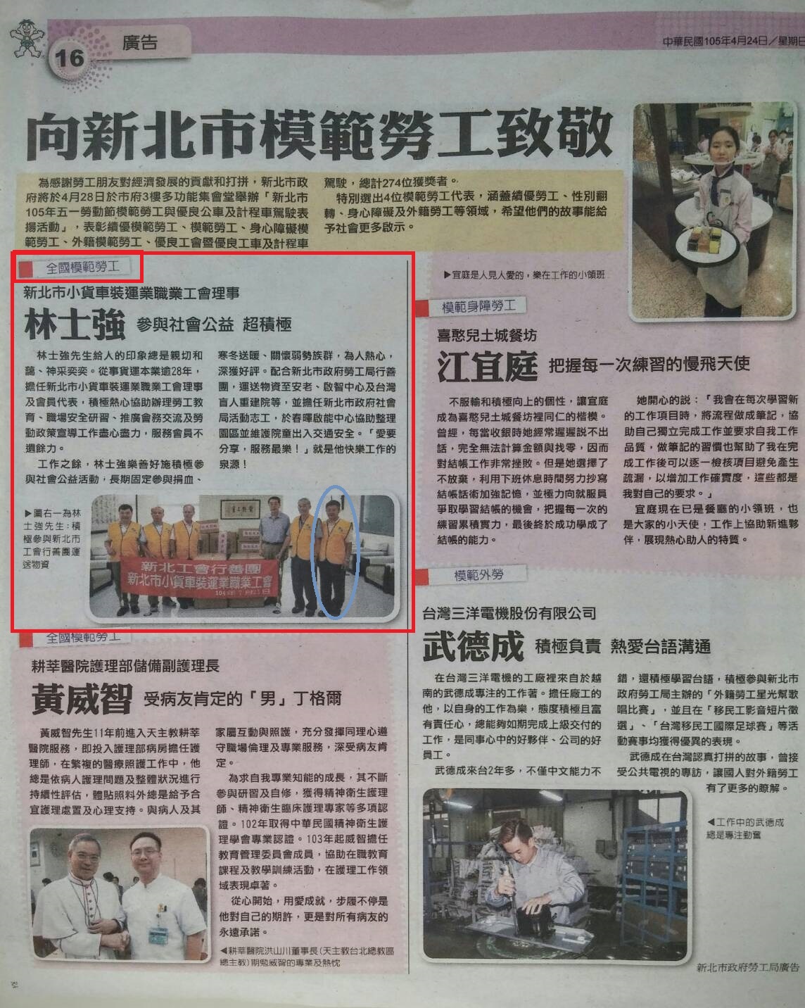 賀喜本會【林理事士強】榮獲~全國模範勞工暨新北市政府績優模範勞工~殊榮